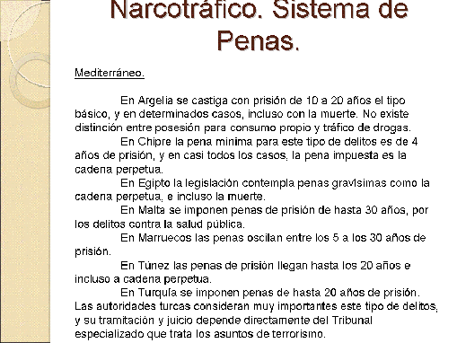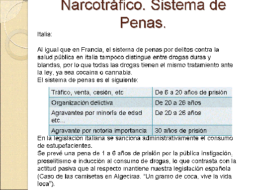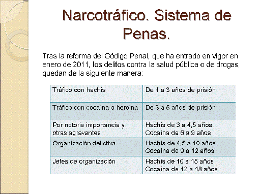 La Reforma del Código Penal, entró en vigor el 23 de diciembre de 2010, y esta Ley es benévola con los presos condenados por narcotráfico. Ya se han ido rebajando las penas y se han producido excarcelaciones. A la pregunta, ¿son muchas o son pocas las personas condenadas y que se han beneficiado de esta reforma? Pues tras examinar más de cuatrocientos expedientes, han sido favorables ochenta y uno y desfavorables más de trecientos. Unos de los motivos de esta reforma ha sido suavizar las condenas a quienes no las merecían, pero la ley es para todos, y ha suavizado también las condenas a quienes si la merecían.